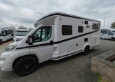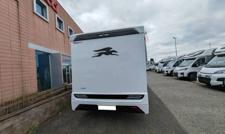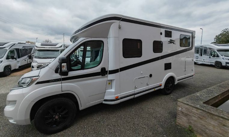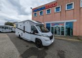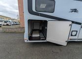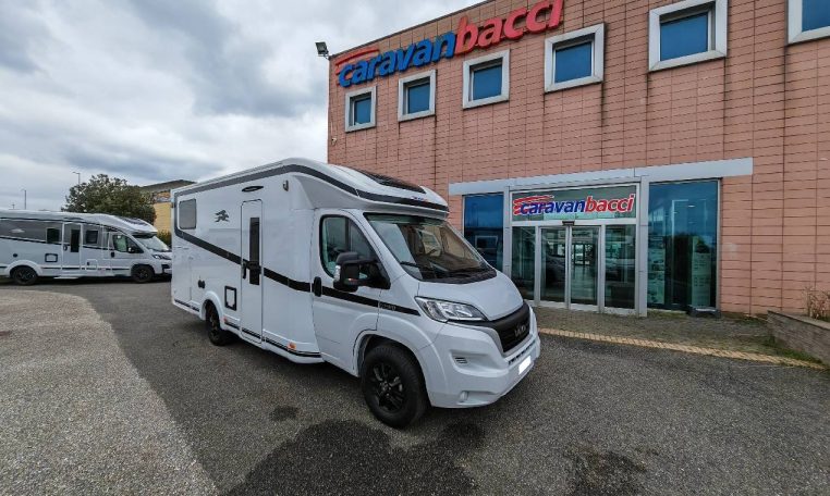 Semintegrale con letti singoli gemelli posteriori e sottostante gavone garage, bagno con parete girevole per doccia, cucina con frigo 140l, dinette a L con divanetto singolo laterale e sedili anteriori girevoli, letto basculante matrimoniale.